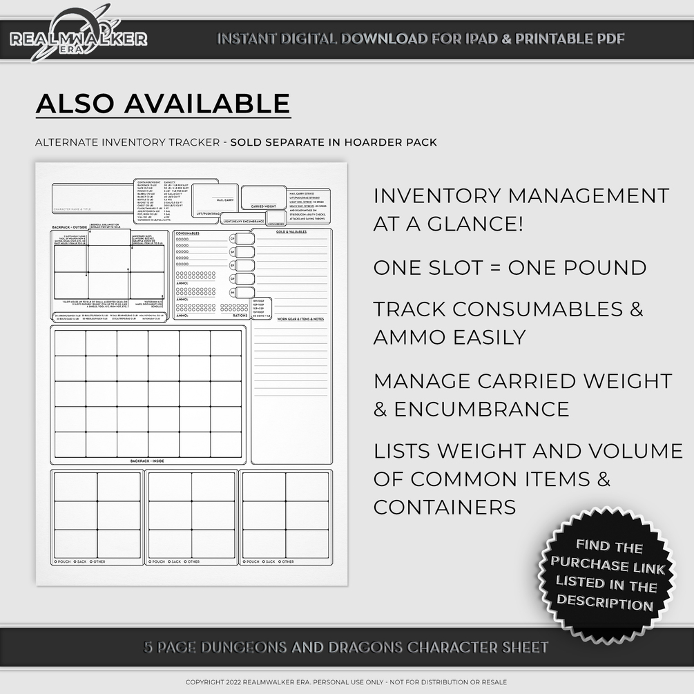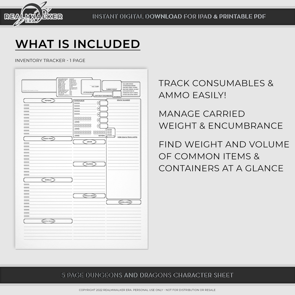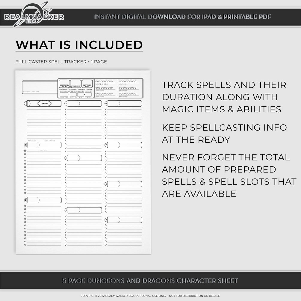 This pack includes 5 printable PDF pages to help you keep track of your character and belongings: 1: character stats & skills 2: character bio 3: spell sheet & trackers for full casters 4: spell sheet & trackers for half casters 5: inventory & consumable manager