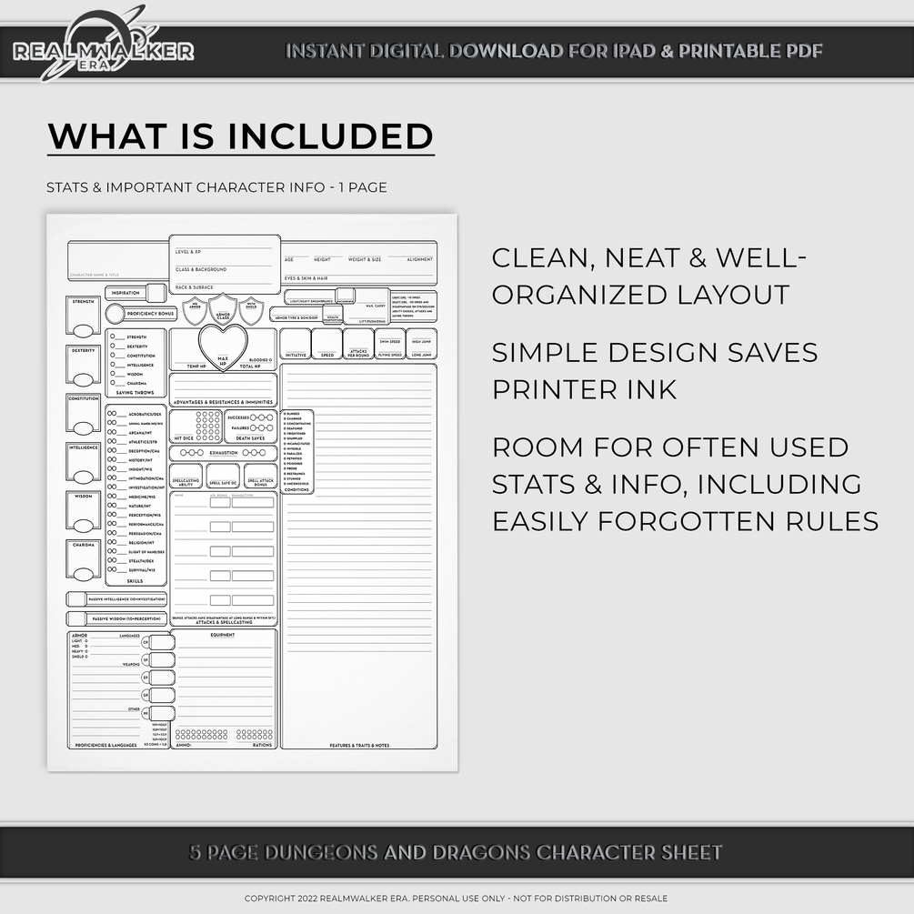 Looking for a clean and well-organized character sheet for your next Dungeons and Dragons game? Look no further! This instant digital downloadable and printable PDF 5e character sheet is just what you need, and can also be used in iPad note apps like Goodnotes & Notability